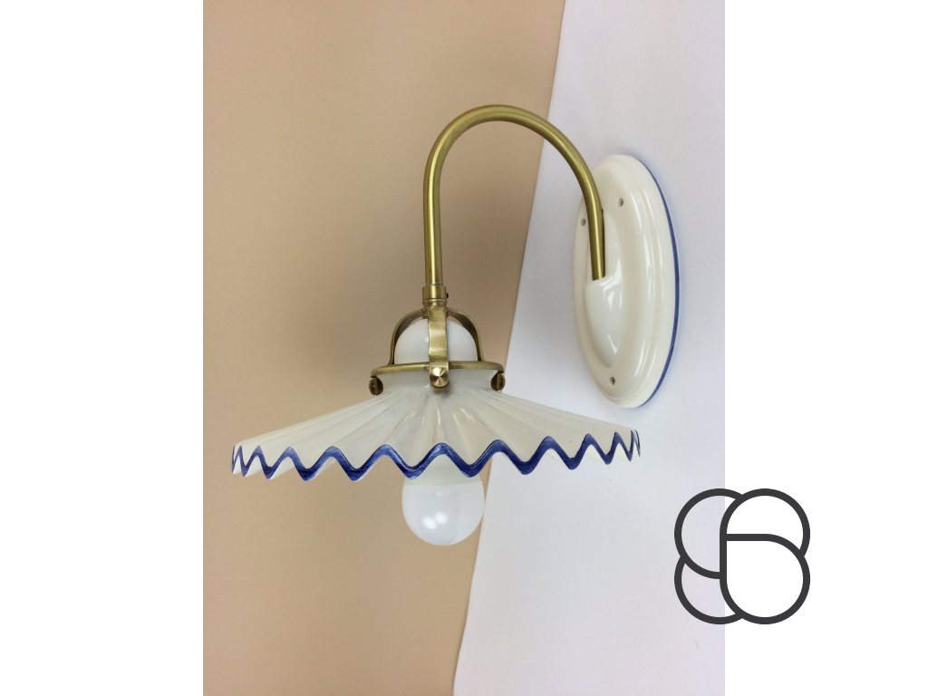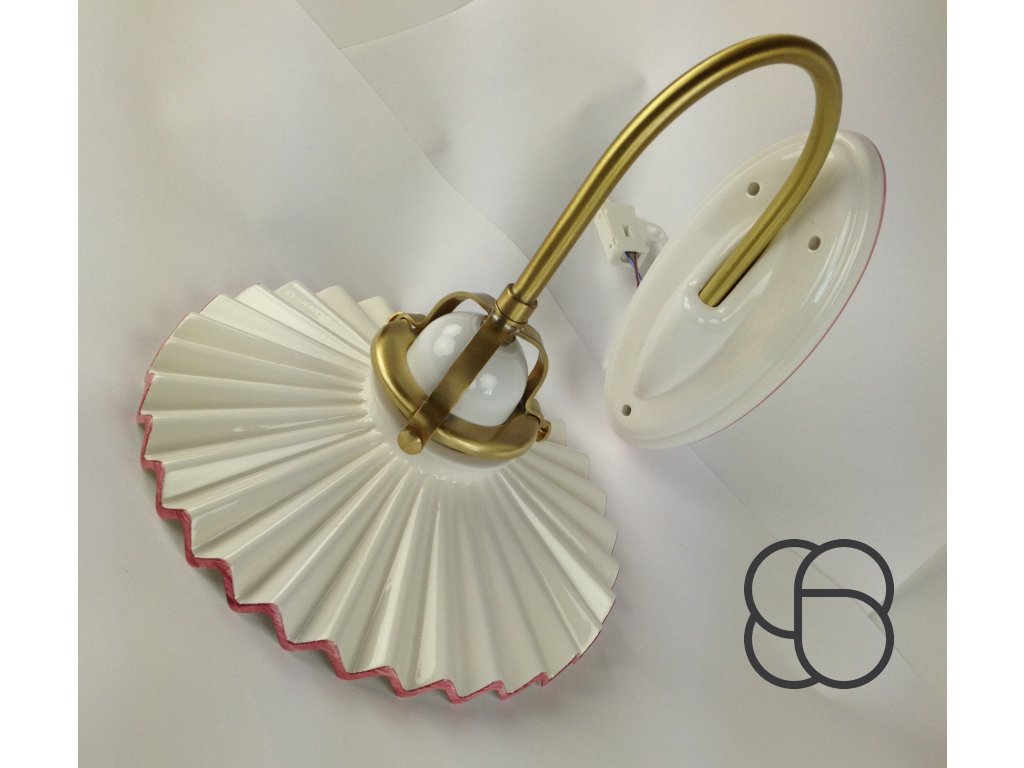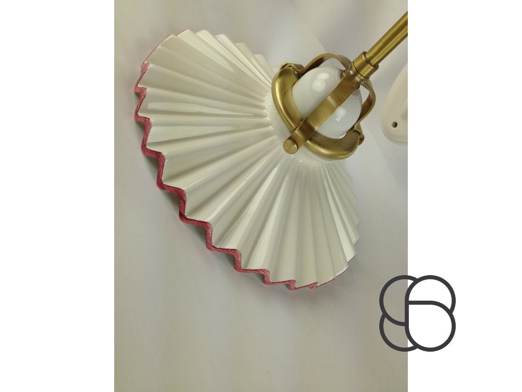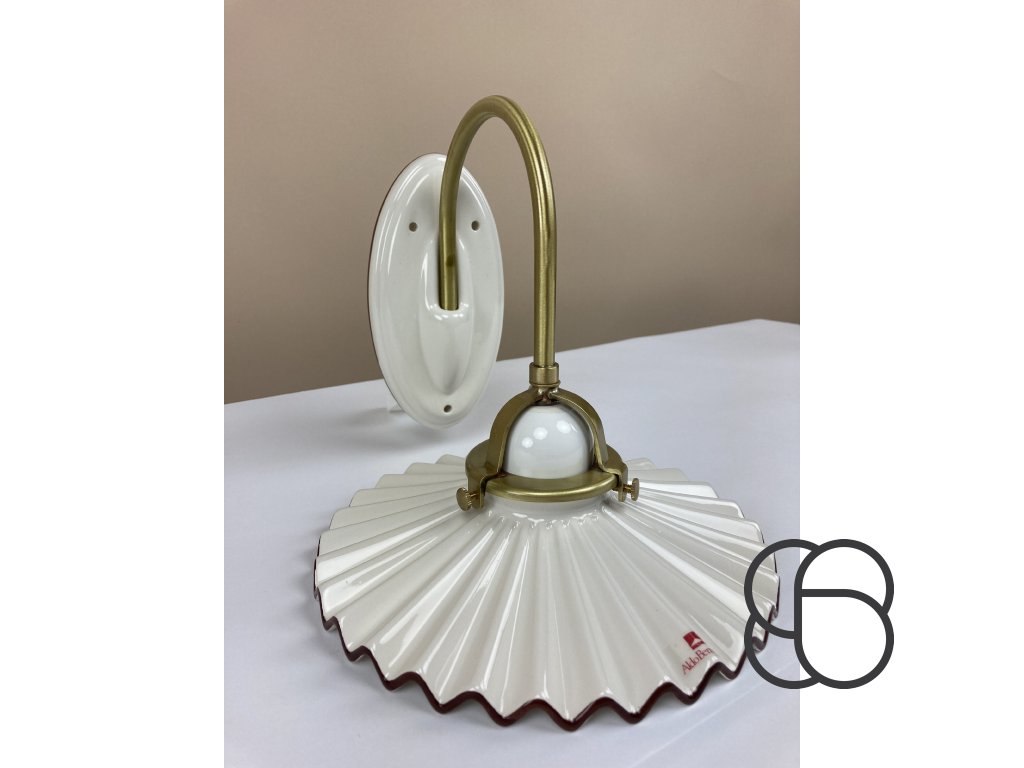 Nástěnné retro svítidlo Linea Piega s porcelánovým úchytem, mosaznou konstrukcí a porcelánovým úchytem objímky. Zajímavě tvarované vlnité stínítko (Ø 22 cm) je pak vyrobeno z bílého glazovaného porcelánu. Stínítko lze dozdobit ručně malovanou linkou (viz náhledy níže).
