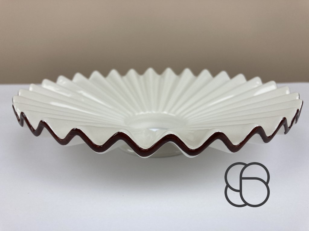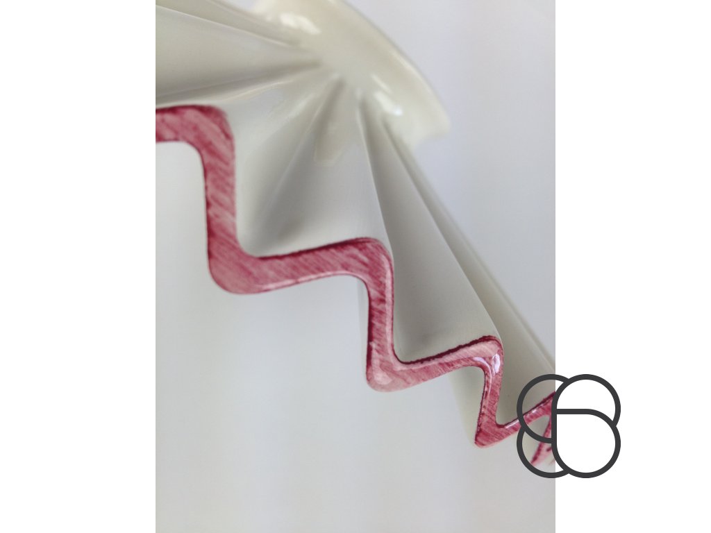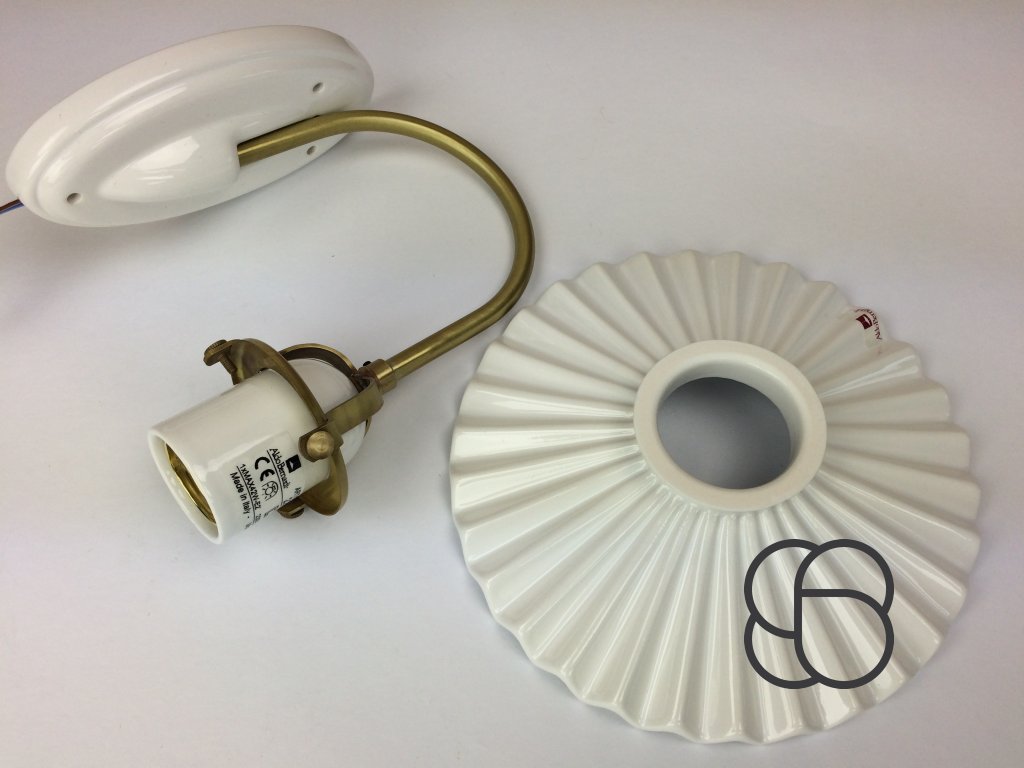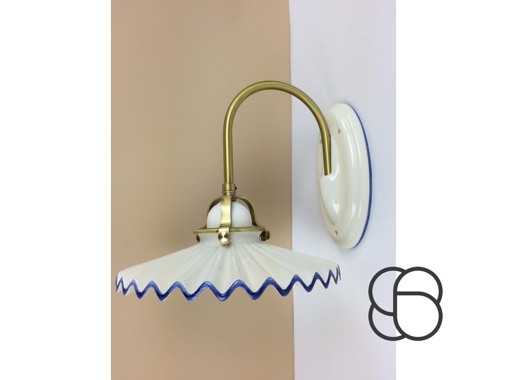 Nástěnné retro svítidlo Linea Piega s porcelánovým úchytem, mosaznou konstrukcí a porcelánovým úchytem objímky. Zajímavě tvarované vlnité stínítko (Ø 22 cm) je pak vyrobeno z bílého glazovaného porcelánu. Stínítko lze dozdobit ručně malovanou linkou (viz náhledy níže).