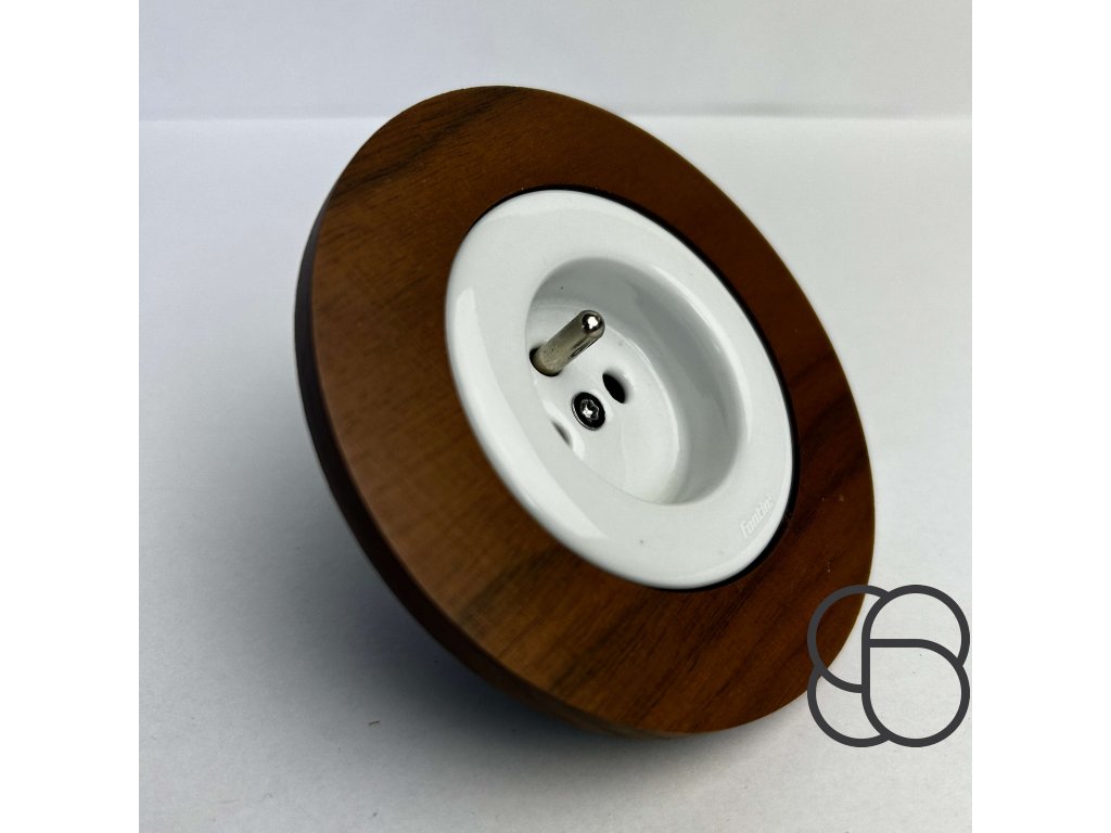 Moderní zásuvka LOW firmy Fontini z bílého porcelánu určena pro montáž do krabice pod omítku tzv. zapuštění do zdi. V sestavě s rámečkem LOW v provedení vlašský ořech.