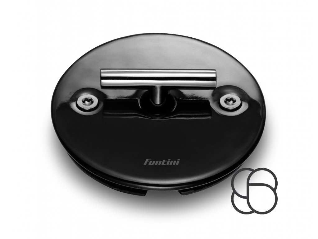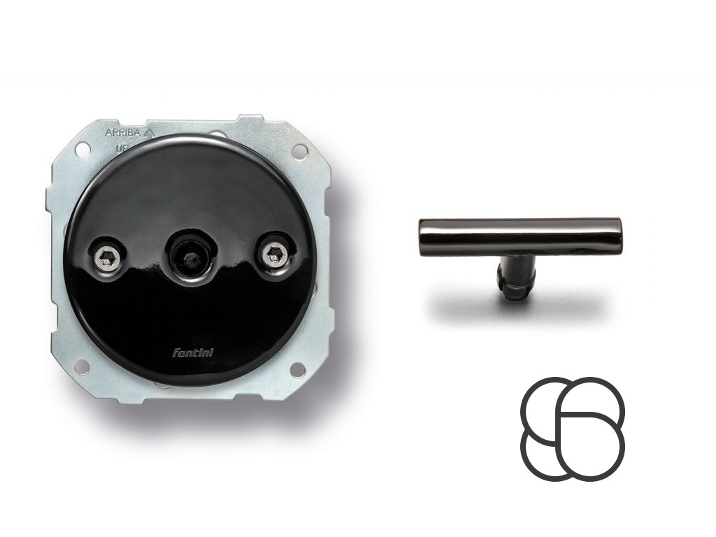 Moderní vypínač LOW firmy Fontini s kličkou v provedení tmavý nikl a otočným mechanismem zapínání a vypínání. Skládá se ze strojkového mechanismu, černého porcelánového krytu, kličky z ušlechtilého kovu v úpravě tmavý nikl a dvou šroubků k uchycení porcelánového krytu.