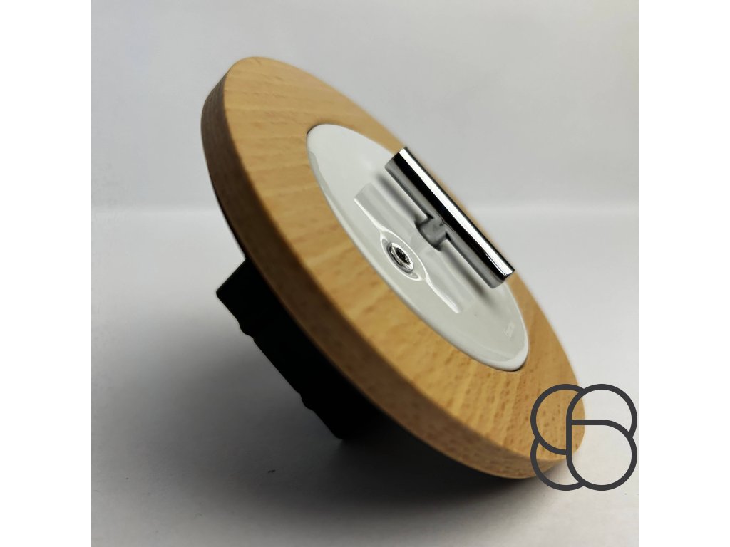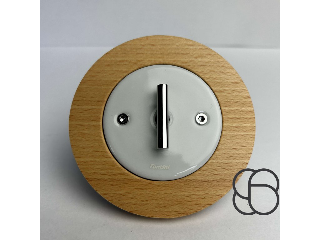 Moderní vypínač LOW (strojek č. 6 - schodišťový) firmy Fontini s kličkou v provedení chrom a otočným mechanismem zapínání a vypínání. V této výprodejové sestavě je k němu nabízený i dřevěný rámeček LOW v provedení natural buk.