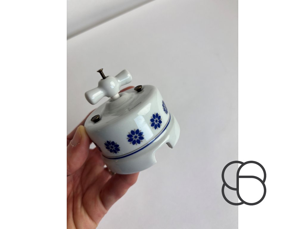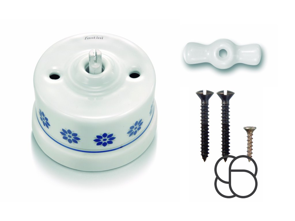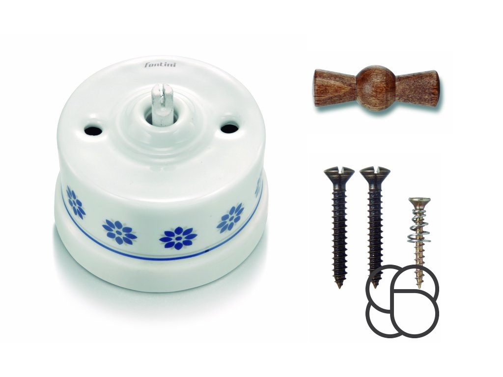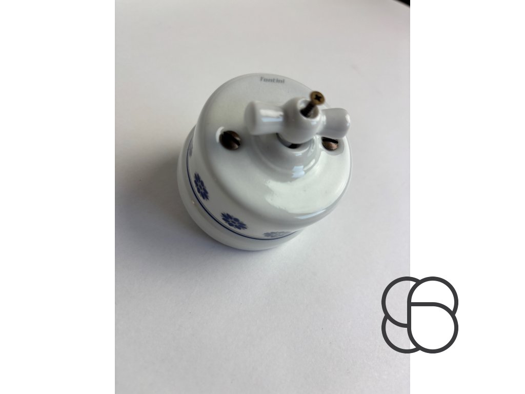 Retro porcelánový vypínač povrchový Garby bílý s modro-stříbrným dekorem, bílou porcelánovou kličkou nebo dřevěnou old wood kličkou průměr 65 mm.
