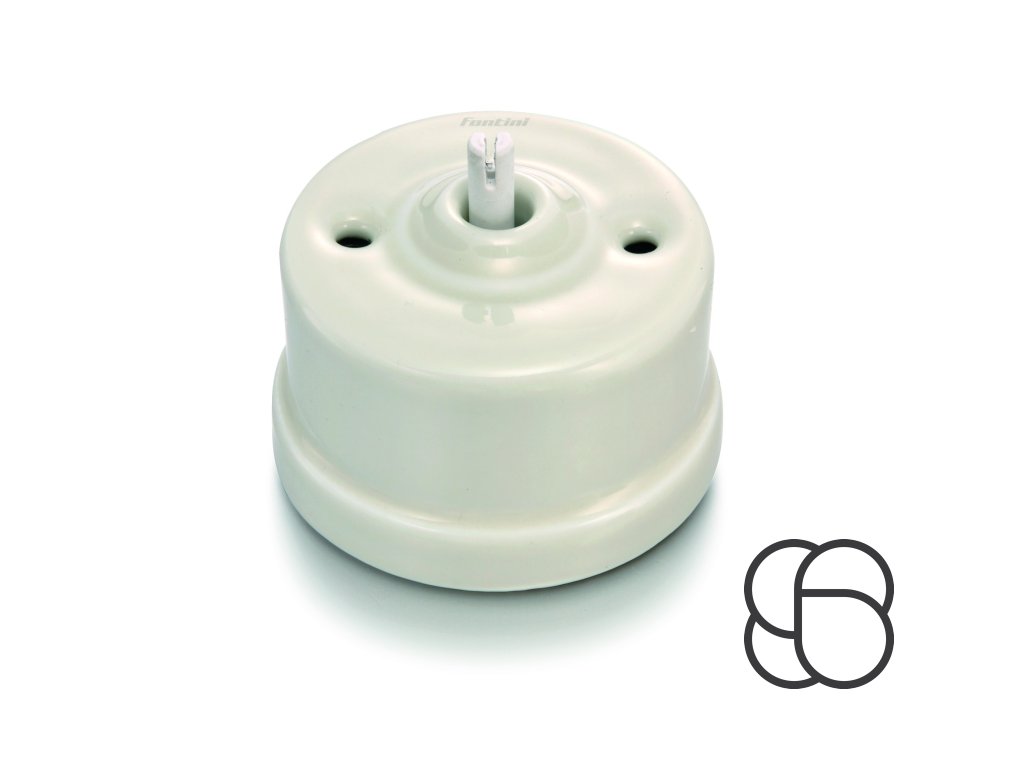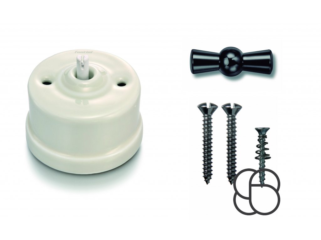 Retro porcelánový vypínač povrchový Garby ve speciálním smetanovém pastelovém odstínu s kovovou tmavě niklovou kličkou, průměr 65 mm.