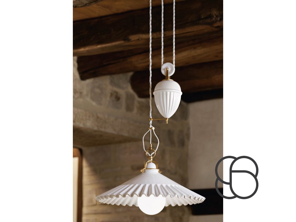 Stropní závěsné stahovací retro svítidlo Linea Duse s porcelánovým stropním úchytem, krouceným přívodním kabelem a porcelánovým úchytem objímky. Svítidlo je vybaveno protizávažím, které umožňuje individuální nastavení výšky i po montáži. Zajímavě tvarované vlnité stínítko (Ø 30 nebo 42 cm) je pak v nabídce z bílého porcelánu nebo v provedení Cotto - pálená hlína.