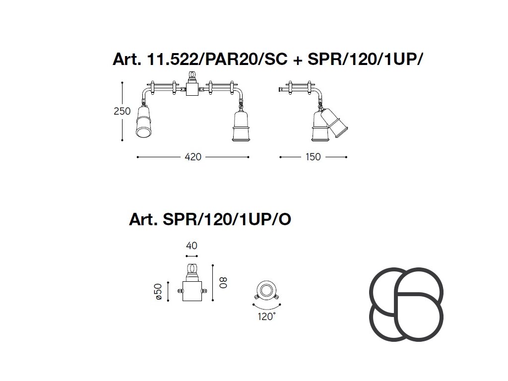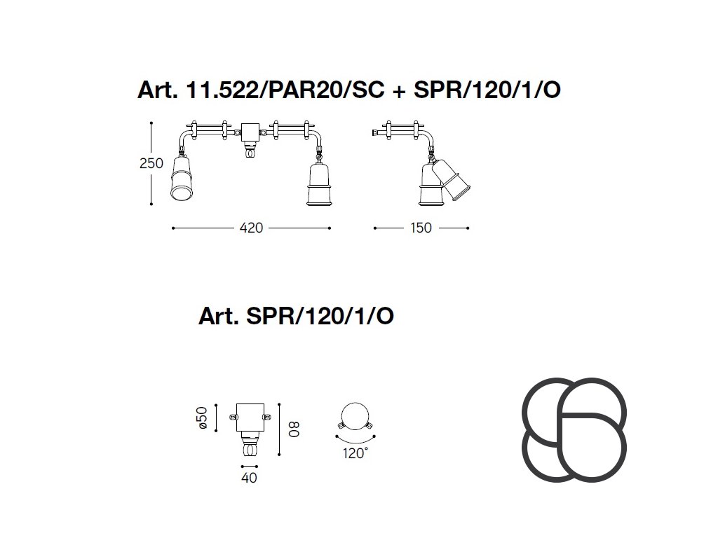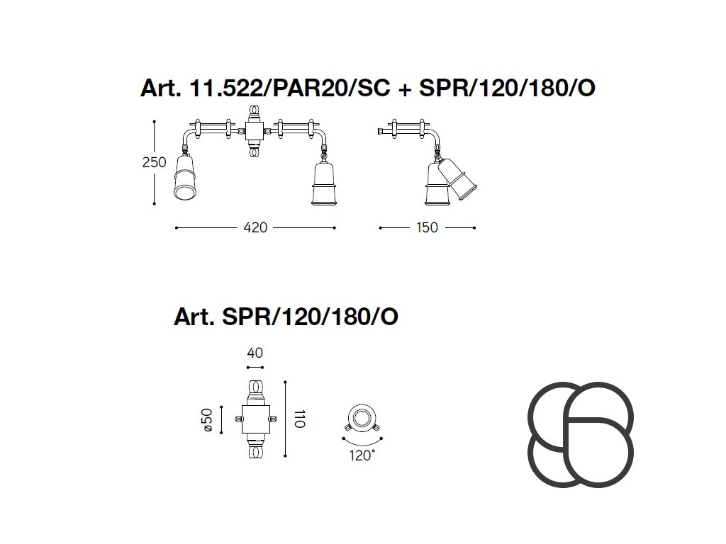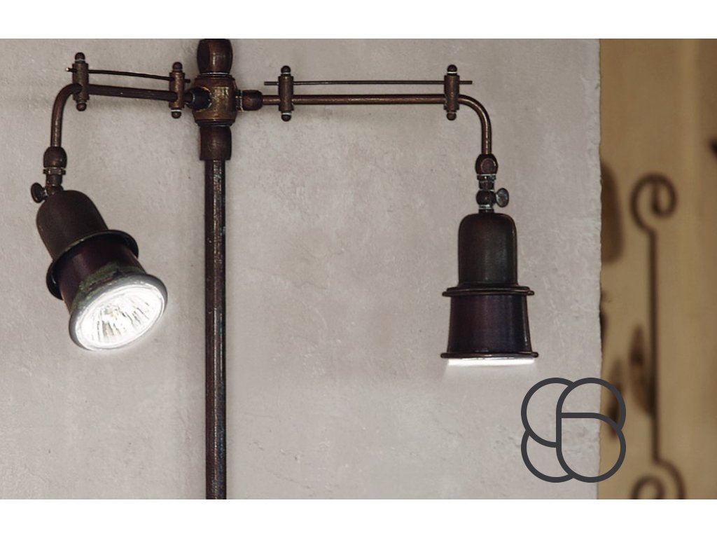 Rustikální mosazné svítidlo Linea Civetta v celomosazné konstrukci s bodovým nastavitelnými reflektory a volitelnými druhy upevňovacích SPR boxů - průchozí, průchozí dolní vývod a průchozí horní vývod.  Vývody průměr 16mm. Svítidlo je určeno pro zasazení do povrchové instalace v trubkových rozvodech.