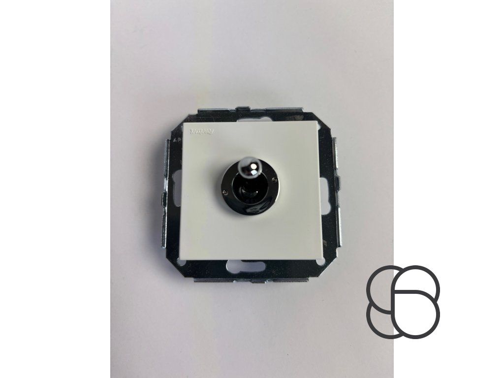 Vypínač F-37 s bílou plastovou základnou a chromovou páčkou.