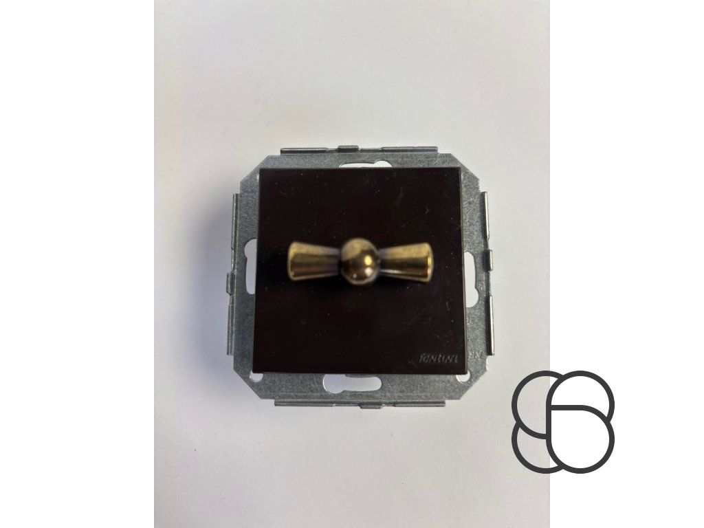 Vypínač F-37 s hnědou plastovou základnou a otočnou kličkou v provedení mašlička - antik bronz.