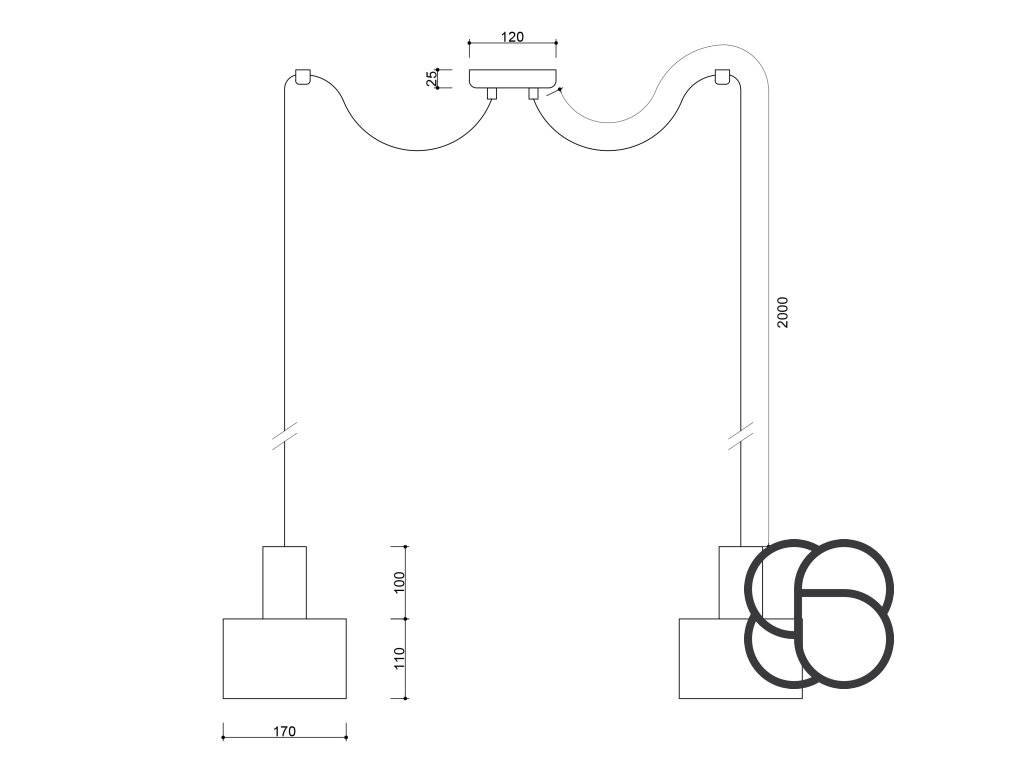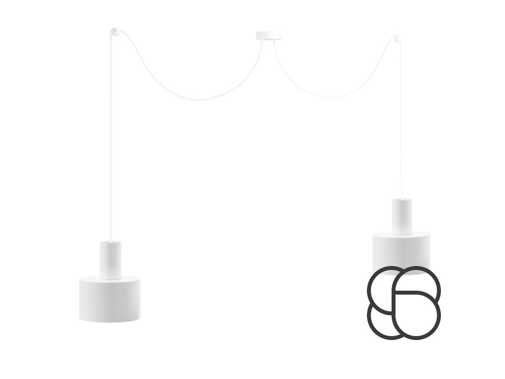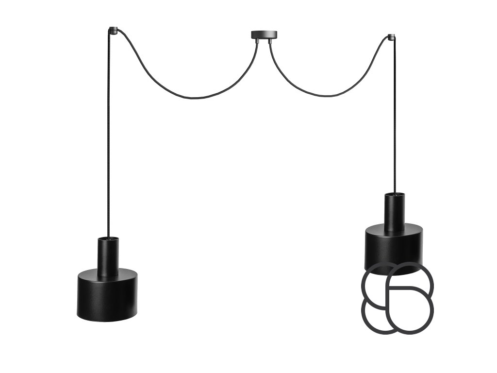 Závěsné stropní designové svítidlo ENKEL 2 v celokovovém provedení se dvěma stínítky, dvěma stropními úchytkami pro uchycení kabelu a kulatou kovovou základnou. Vyrábí se ve dvou variantách černý nebo bílý kov.