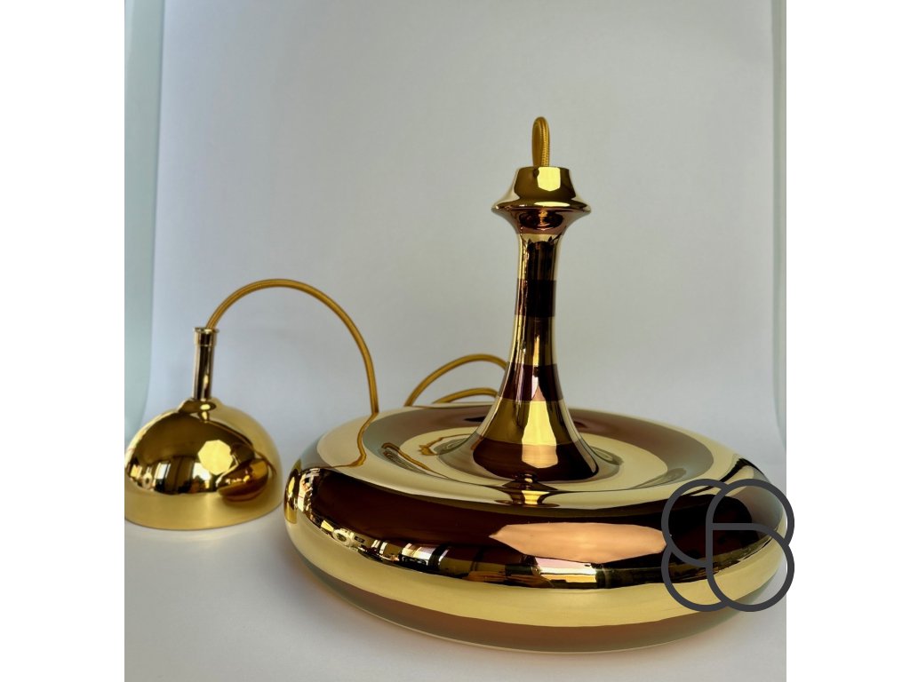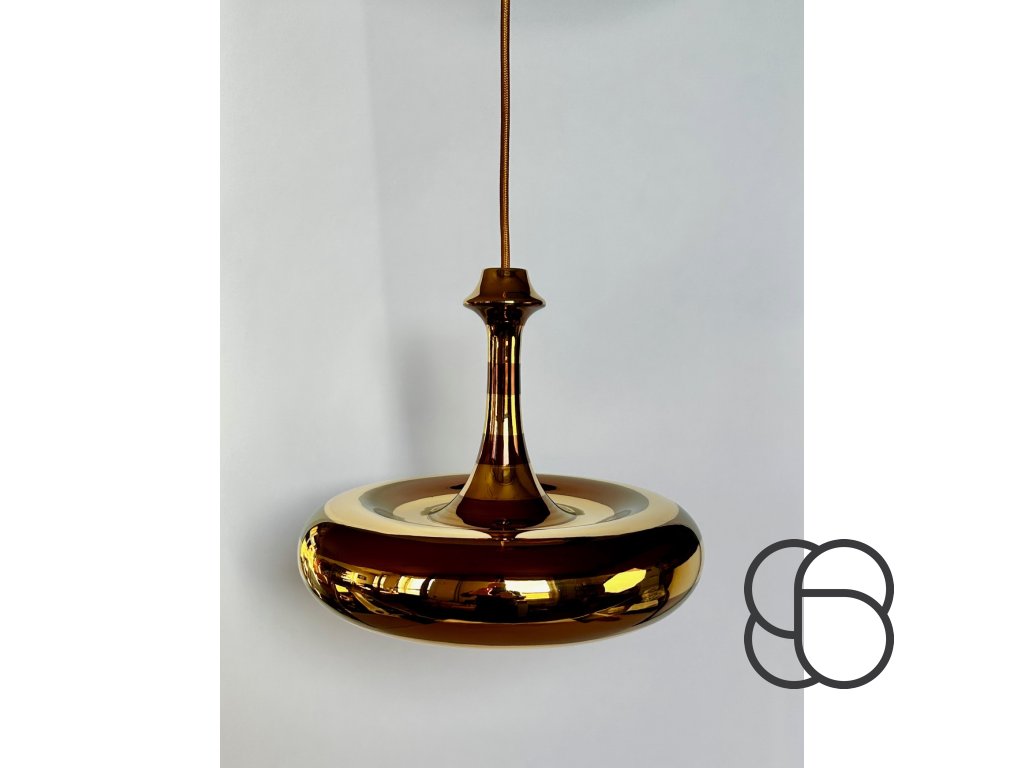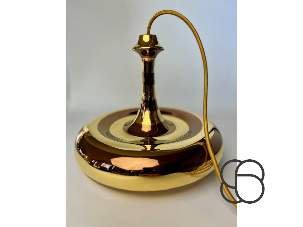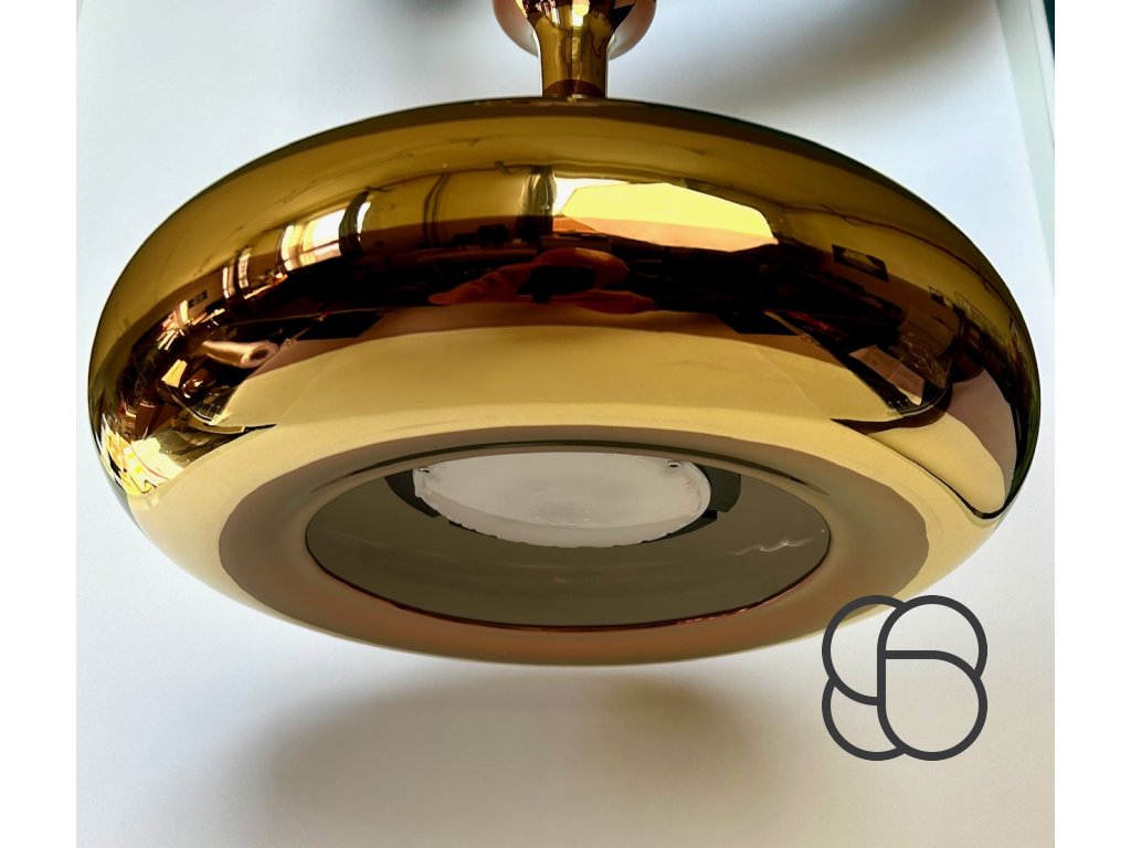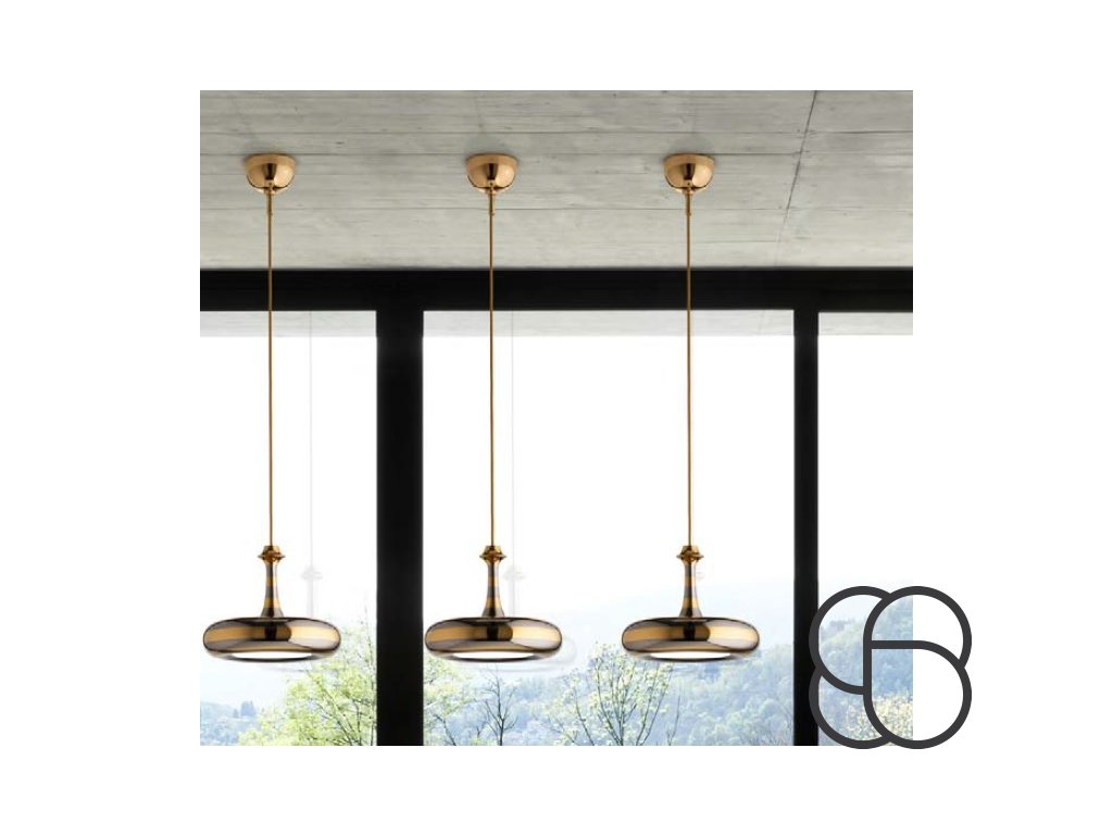 Závěsné stropní svítidlo Linea Lustri italského výrobce Aldo Bernardi - z kolekce luxusních ručně vyráběných světel pozlacených drahými kovy - v tomto případě v provedení 24karátové zlato a měď.
