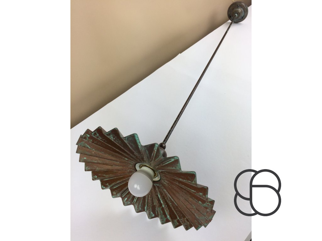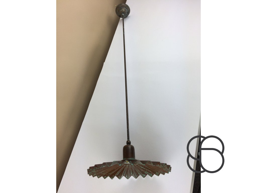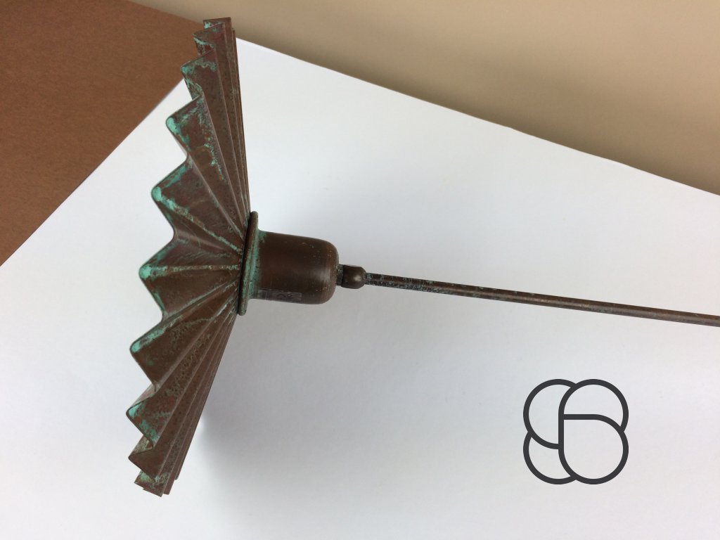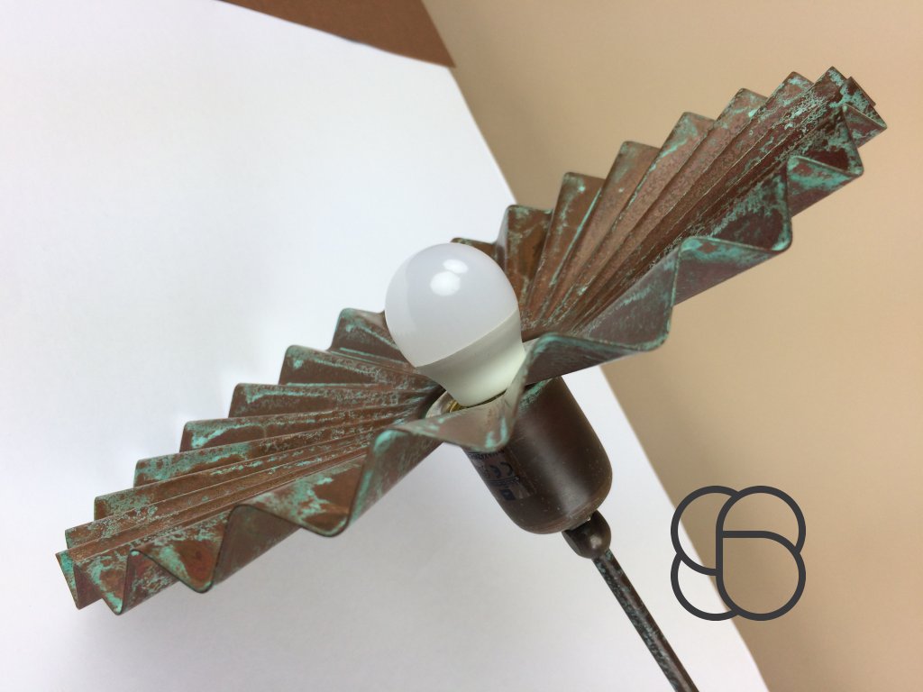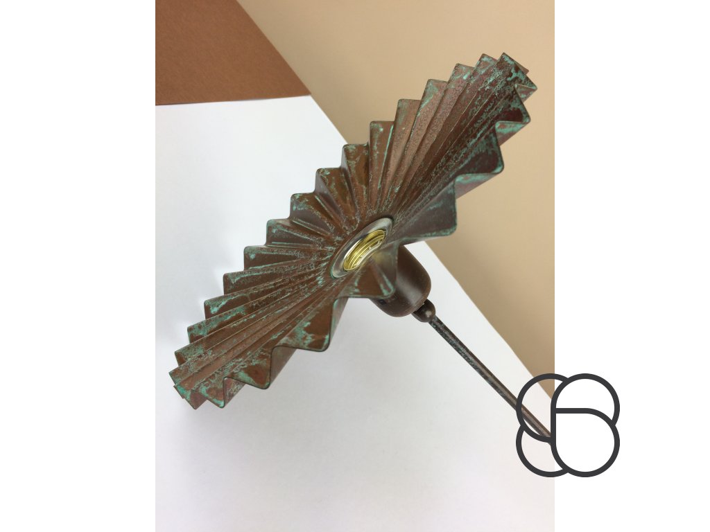 Pevné části u tohoto typu svítidla jako stropní úchyt a nosné tyče či řetězy jsou vyráběny odléváním mosazi, hladká stínítka pak tvarováním surového mosazného plechu do formy a jeho následným pískováním, proto se mohou od konstrukce mírně barevně odlišovat. Mosazné stínítko a obecně mosaz je ovšem materiál, který na vzduchu pracuje, tmavne a prokresluje se až do zelenkavých odstínů, takže velmi brzy získává patinovaný nádech.